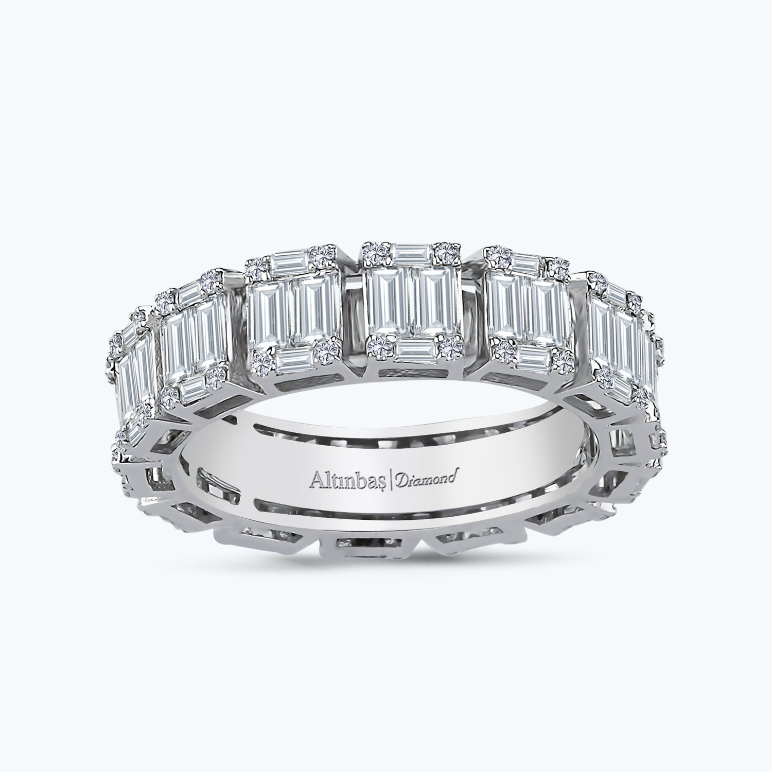 Dieser prächtige Diamantring aus dem Hause Altınbaş Juwelier ist ein wahres Meisterwerk. Hergestellt aus 14-karätigem Weißgold, zeugt er von unserer exquisiten Handwerkskunst und der Liebe zum Detail. Jeder Diamant, der in einer Baguette-Schliff-Form präsentiert wird, ist sorgfältig ausgewählt und gesetzt, um einen atemberaubenden Glanz zu erzeugen. Dieser Ring ist nicht nur ein Schmuckstück, sondern auch ein Zeugnis tiefer Zuneigung. Die Verwendung von Diamanten in einem Ewigkeitsdesign symbolisiert eine endlose Einheit und Liebe, die niemals endet. Jeder Diamant ist ein Zeichen der Beständigkeit und der unzerbrechlichen Bindung, die Sie mit Ihrer Liebsten teilen. Die Reinheit und das Funkeln der Diamanten, gepaart mit dem kühlen Glanz des 14-karätigen Weißgoldes, verleihen diesem Ring eine zeitlose Eleganz. Er ist perfekt für Frauen, die einen Hauch von Luxus und Raffinesse zu ihrem täglichen Stil hinzufügen möchten. Mit seinem atemberaubenden Design und der hervorragenden Verarbeitung ist dieser Diamantring von Altınbaş Juwelier ein echtes Statement-Piece. Er ist mehr als nur ein Schmuckstück - er ist ein Ausdruck Ihrer unendlichen Liebe und Wertschätzung. Schenken Sie diesen Ring als Zeichen Ihrer tiefen Zuneigung und lassen Sie ihn zu einem Symbol Ihrer ewigen Liebe werden. In der Welt der Juweliere steht Altınbaş für Qualität und Raffinesse. Mit diesem Diamantring beweisen Sie Ihren exquisiten Geschmack und Ihre Wertschätzung für hochwertigen Schmuck.
